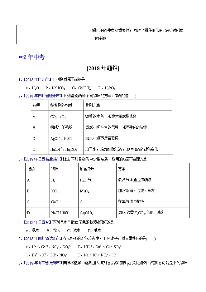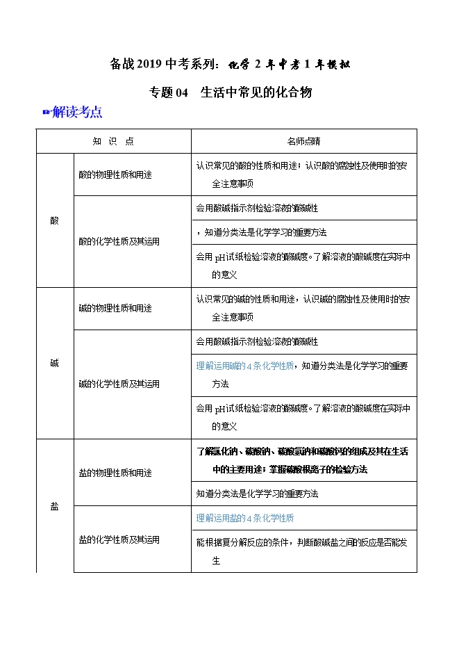 【内容简介】2019年备战中考化学精品系列2年中考1年模拟专题04 生活中常见的化合物-(原卷版)