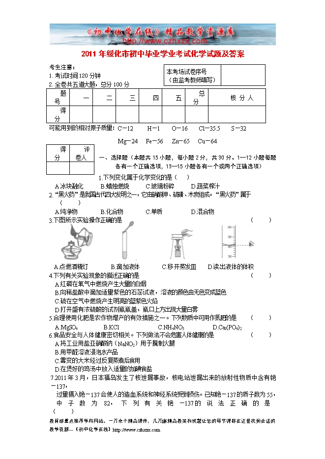 - 下一份试卷:2011年山东省青岛市初中毕业生学业统一考试化学试题及答案