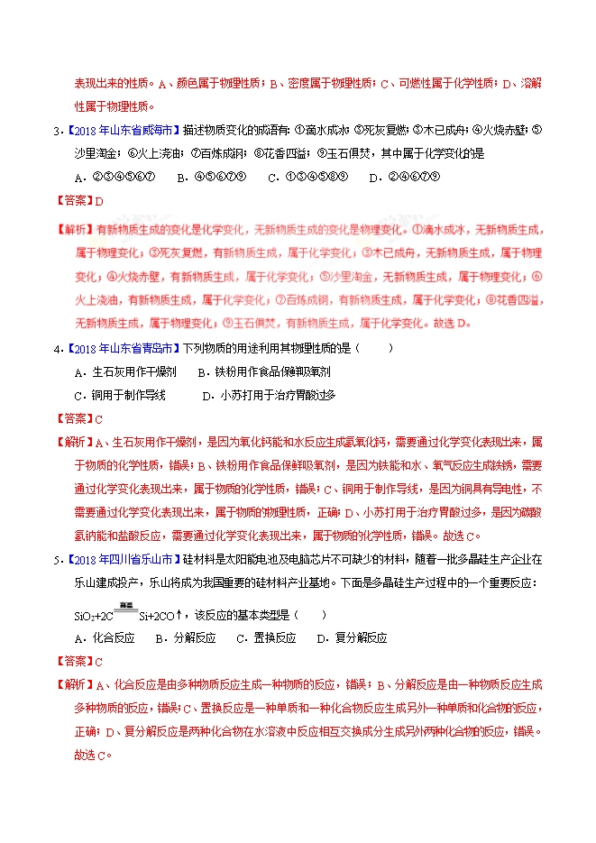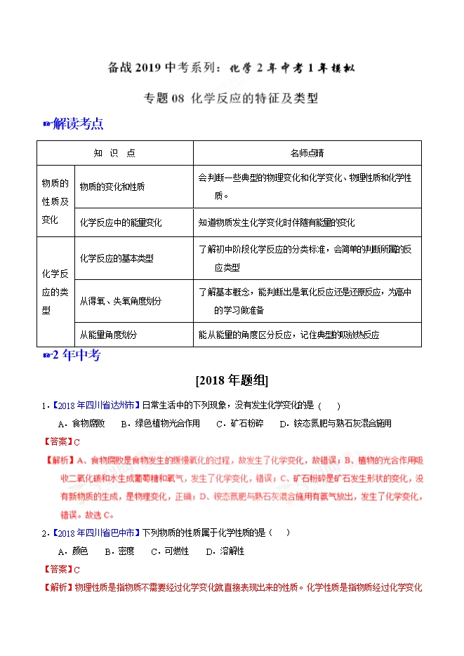 【内容简介】2019年备战中考化学精品系列2年中考1年模拟专题08 化学反应的特征及类型(解析版)
