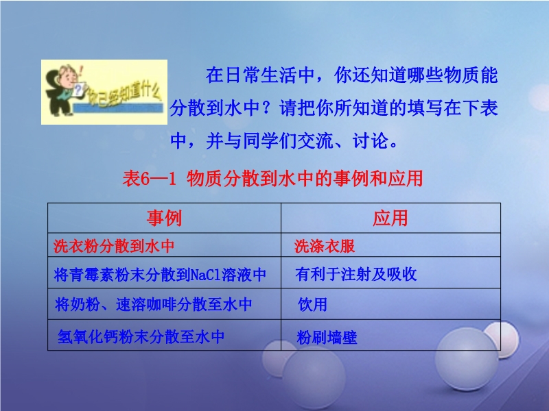 - 2962015年新沪教版九年级化学下册《6.1物质在水中的分散(第一课时)》精品备课PPt课件