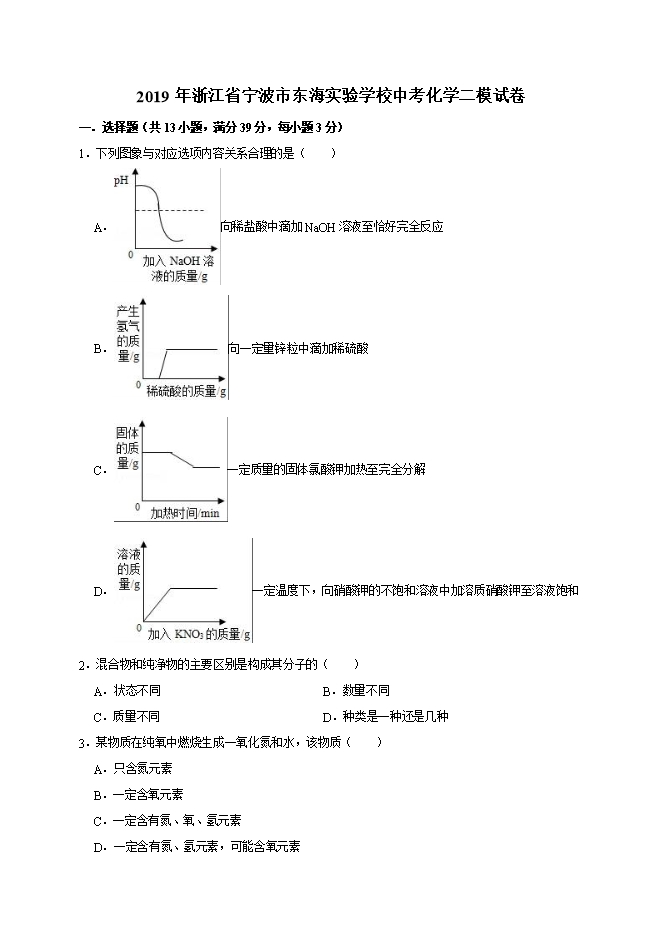 【内容简介】2019年浙江省宁波市东海实验学校中考化学二模试卷(解析版)