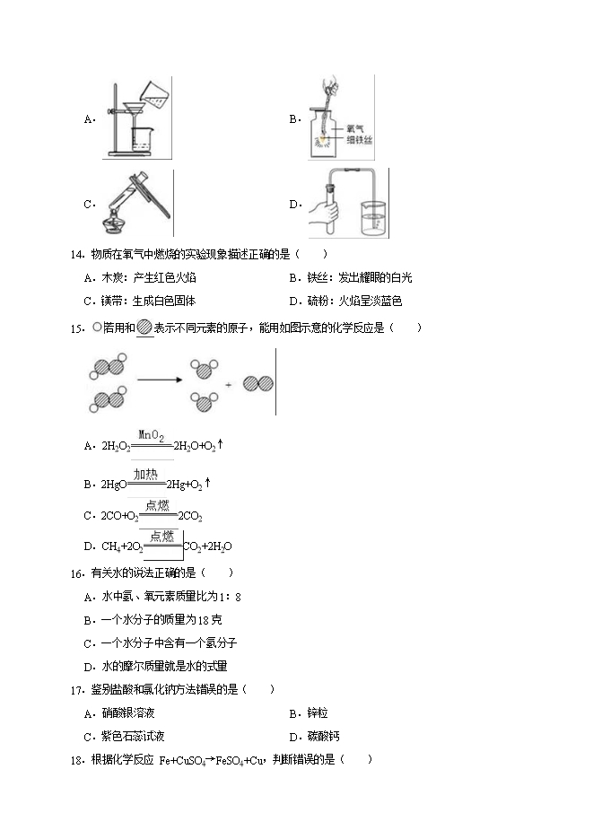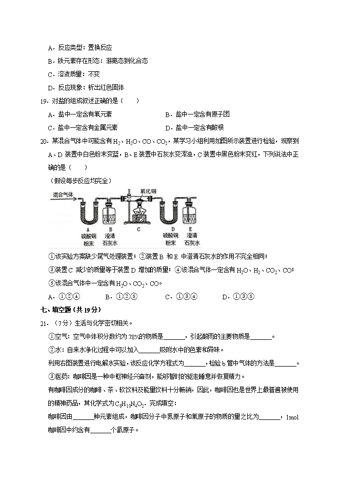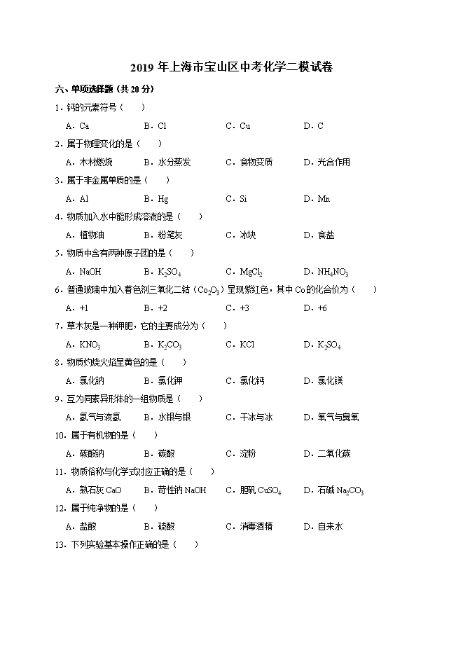 【内容简介】2019年上海市宝山区中考化学二模试卷(word解析版)