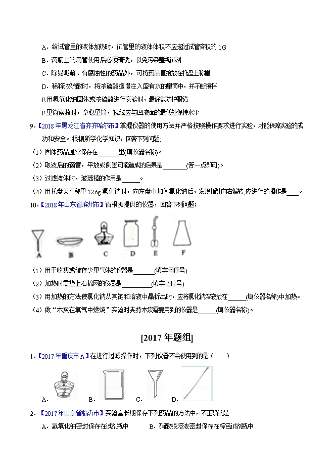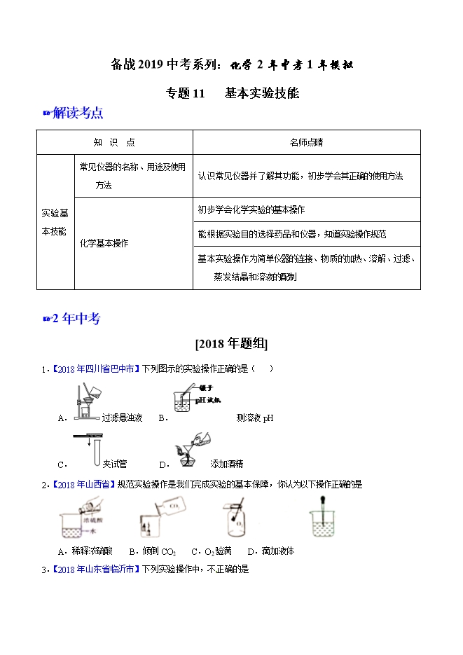 【内容简介】2019年备战中考化学精品系列2年中考1年模拟专题11 基本实验技能(原卷版)