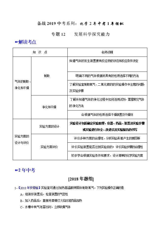 【内容简介】2019年备战中考化学精品系列2年中考1年模拟专题12 发展科学探究能力(解析版)