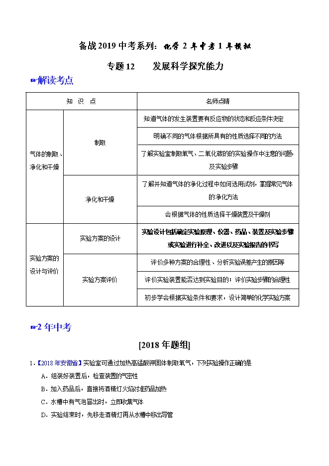 【内容简介】2019年备战中考化学精品系列2年中考1年模拟专题12 发展科学探究能力(原卷版)