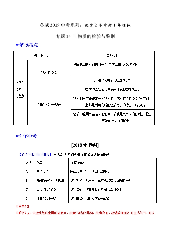 【内容简介】2019年备战中考化学精品系列2年中考1年模拟专题14 物质的检验和鉴别(解析版)