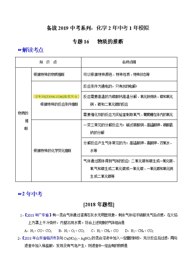 2019年备战中考化学精品系列2年中考1年模拟专题16 物质的推断(原卷版)