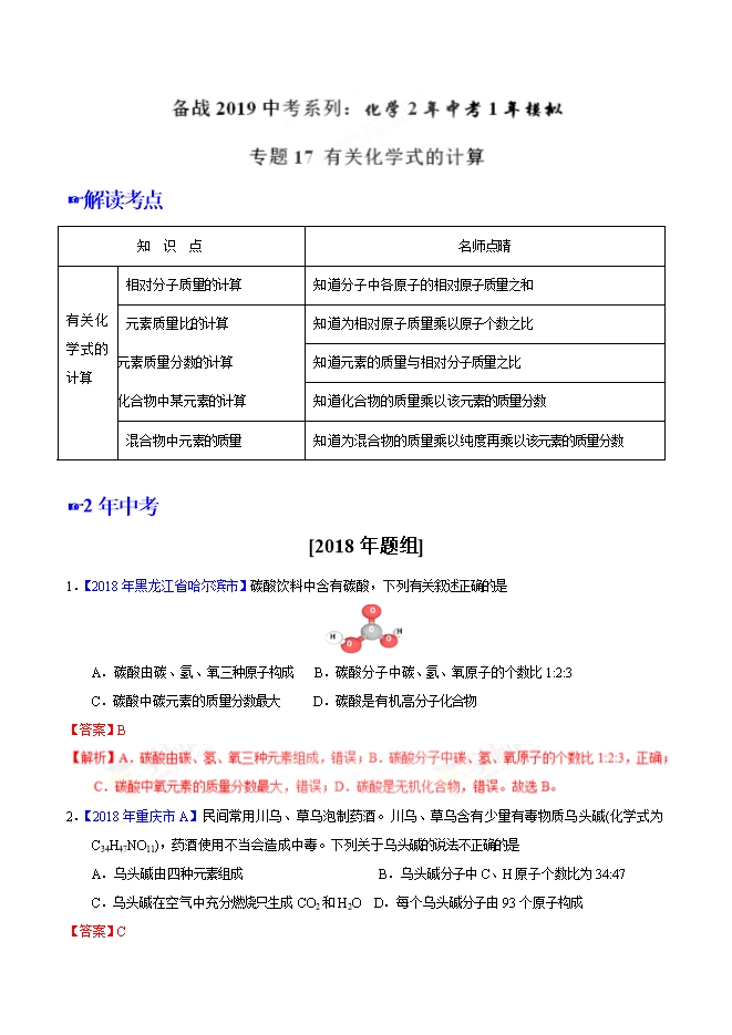 【内容简介】2019年备战中考化学精品系列2年中考1年模拟专题17 有关化学式的计算(解析版)