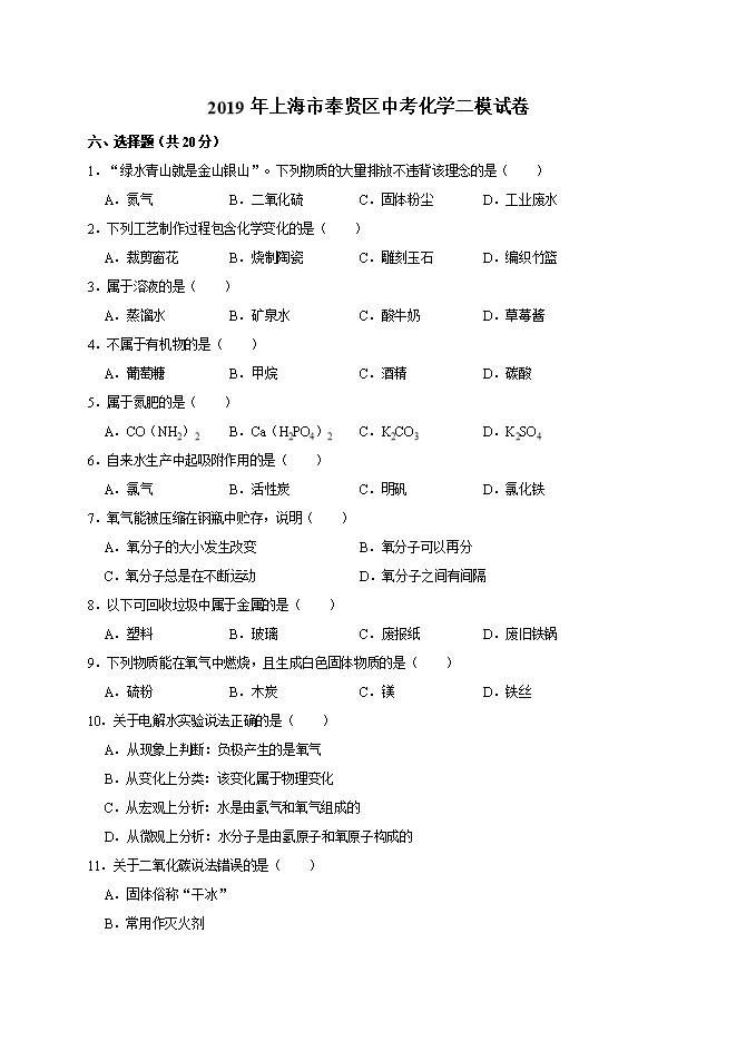 2019年上海市奉贤区中考化学二模试卷(解析版)