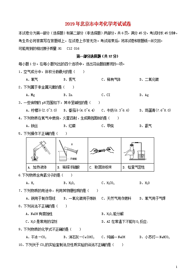 【内容简介】2019年北京市中考化学真题试题(word版含答案)