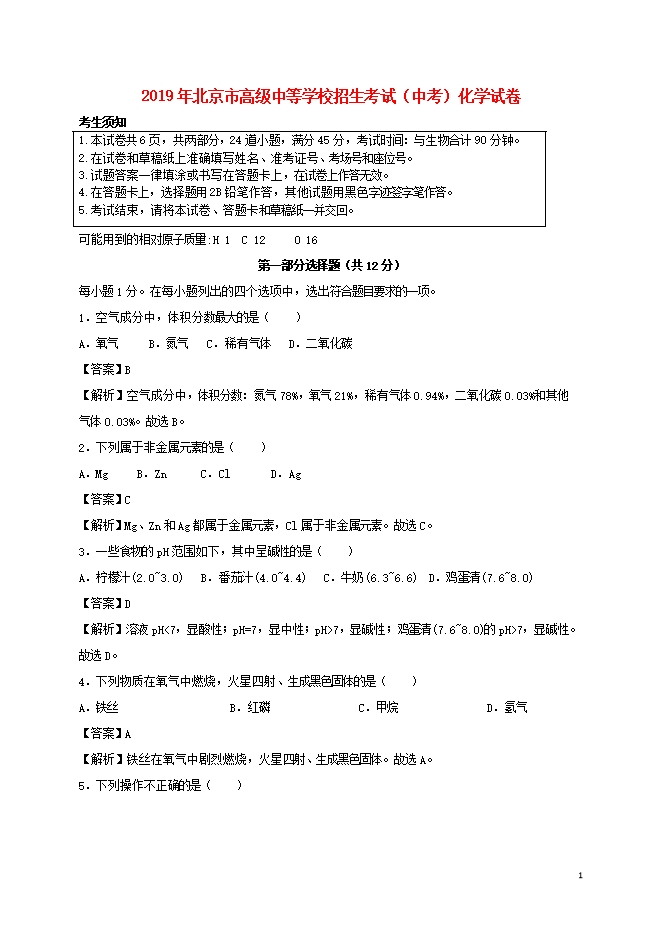 【内容简介】2019年北京市中考化学真题试题(word版含答案解析)