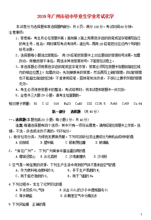 【内容简介】2019年广东省广州市中考化学真题试题(word版含答案)