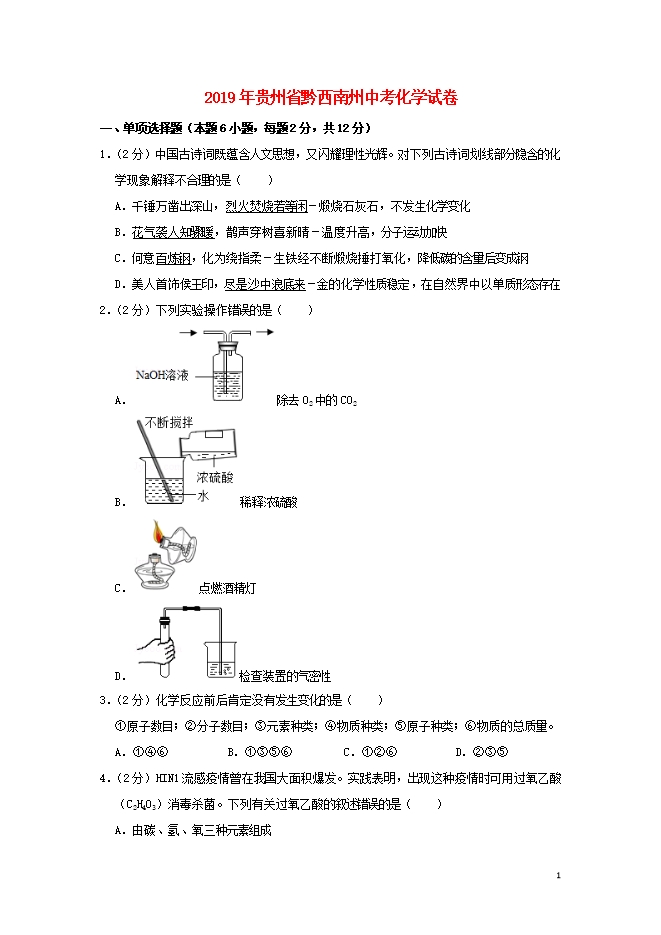 【内容简介】2019年贵州省黔西南州中考化学真题试题(word版含答案解析)
