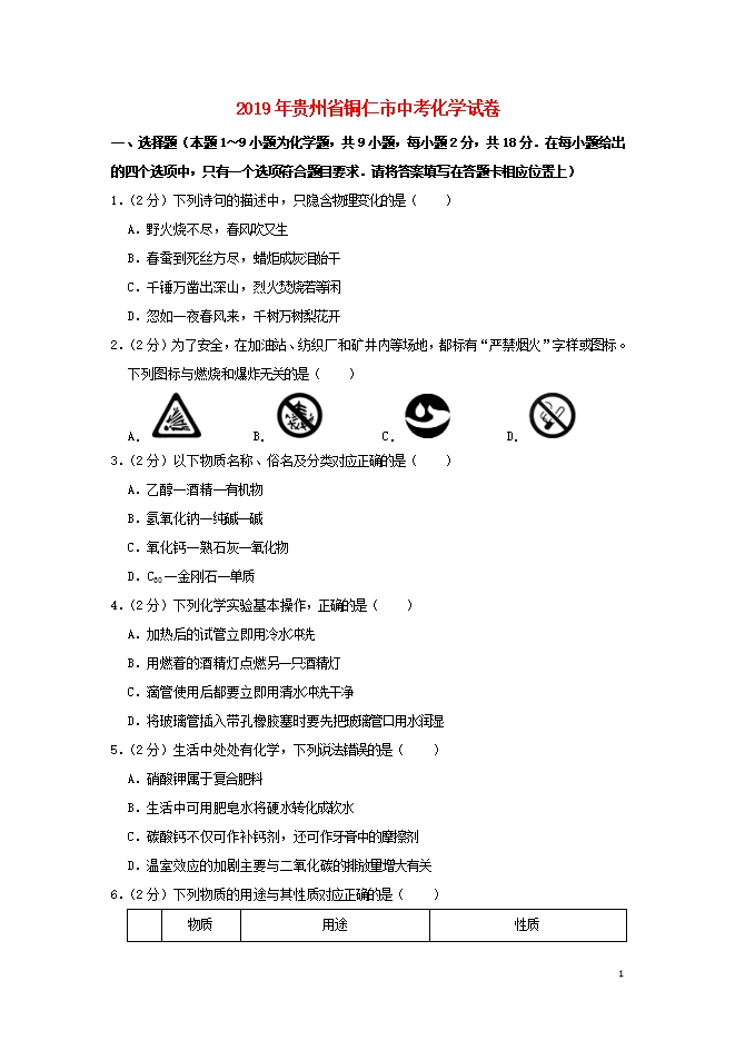 【内容简介】2019年贵州省铜仁市中考化学真题试题(word版含答案解析)