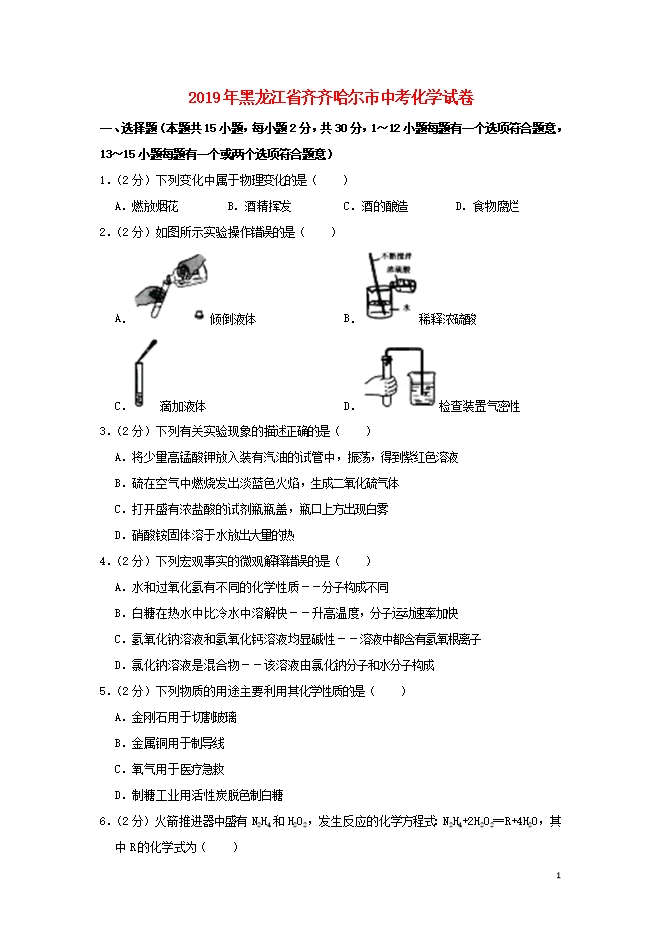 【内容简介】2019年黑龙江省齐齐哈尔市中考化学真题试题(word版含答案解析)