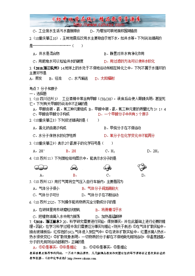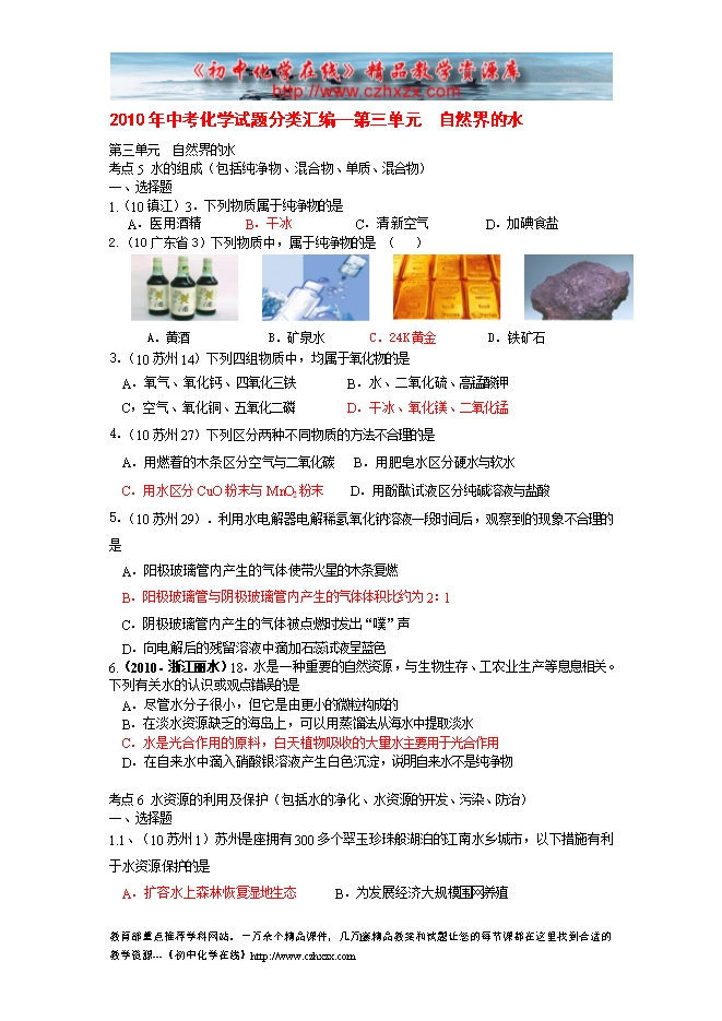 2010年中考化学试题分类汇编—第三单元 自然界的水