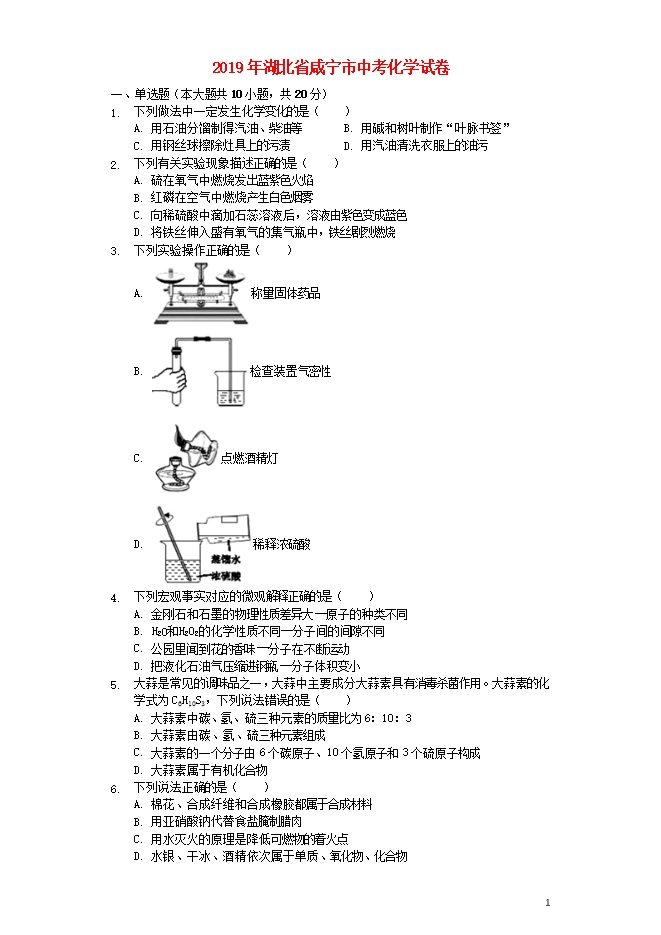 【内容简介】2019年湖北省咸宁市中考化学真题试题(word版含答案解析)