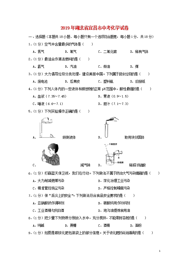 【内容简介】2019年湖北省宜昌市中考化学真题试题(word版含答案解析)