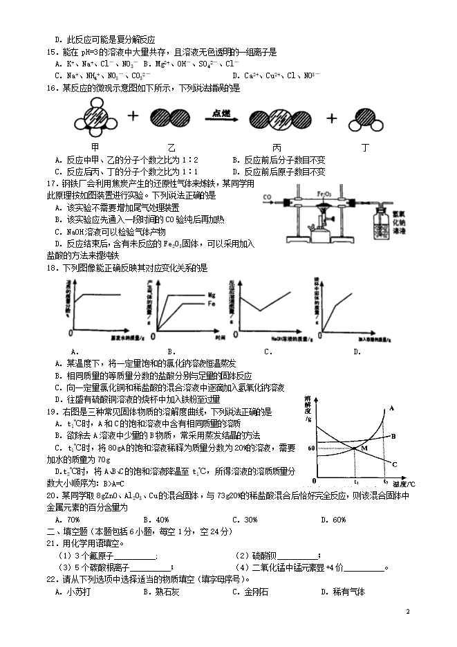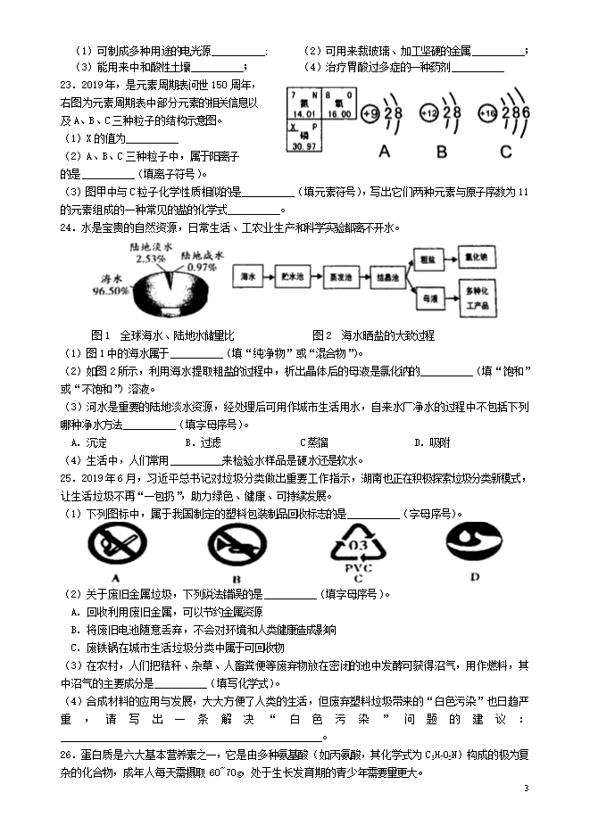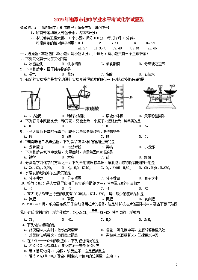 2019年湖南省湘潭市中考化学真题试题(word版含答案)