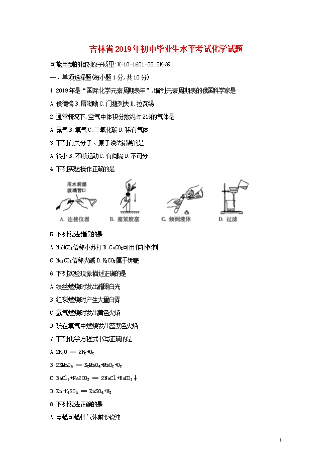 【内容简介】2019年吉林省中考化学真题试题(word版含答案)