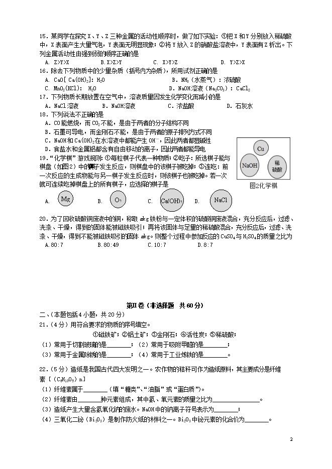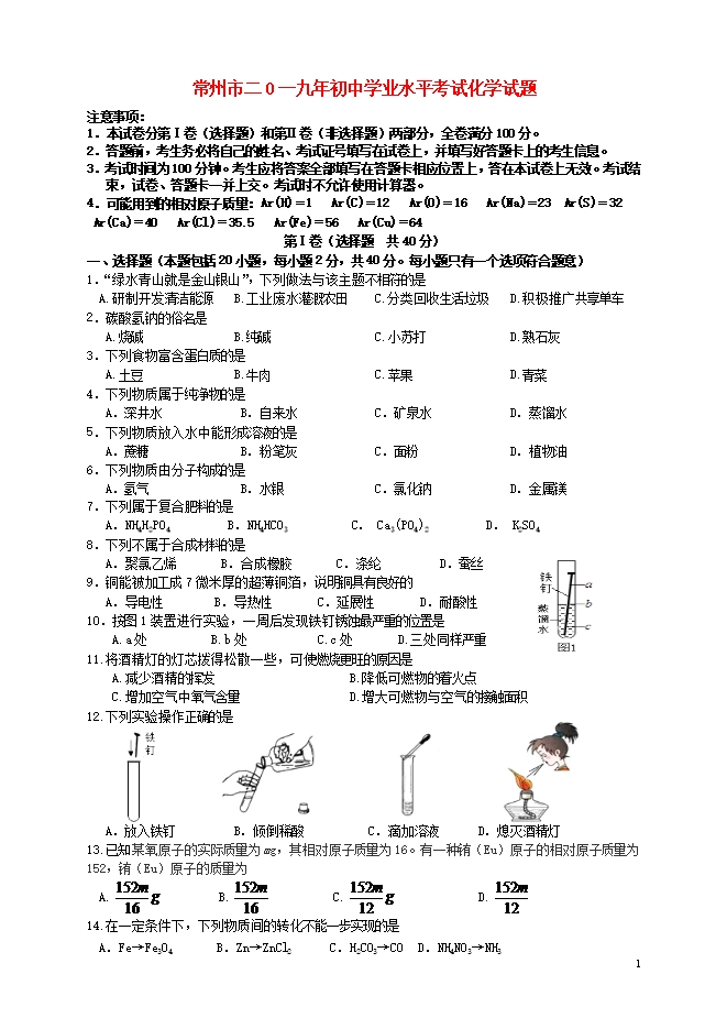 2019年江苏省常州市中考化学真题试题(word版含答案)