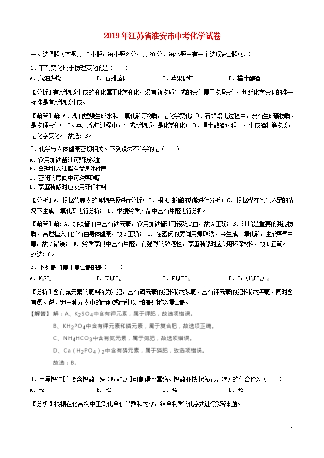 【内容简介】2019年江苏省淮安市中考化学真题试题(word版含答案解析)