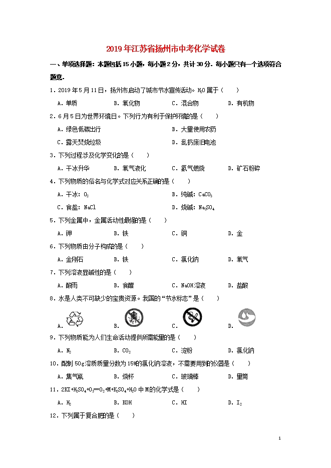 2019年江苏省扬州市中考化学真题试题(word版含答案解析)
