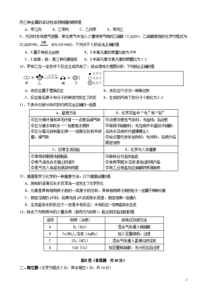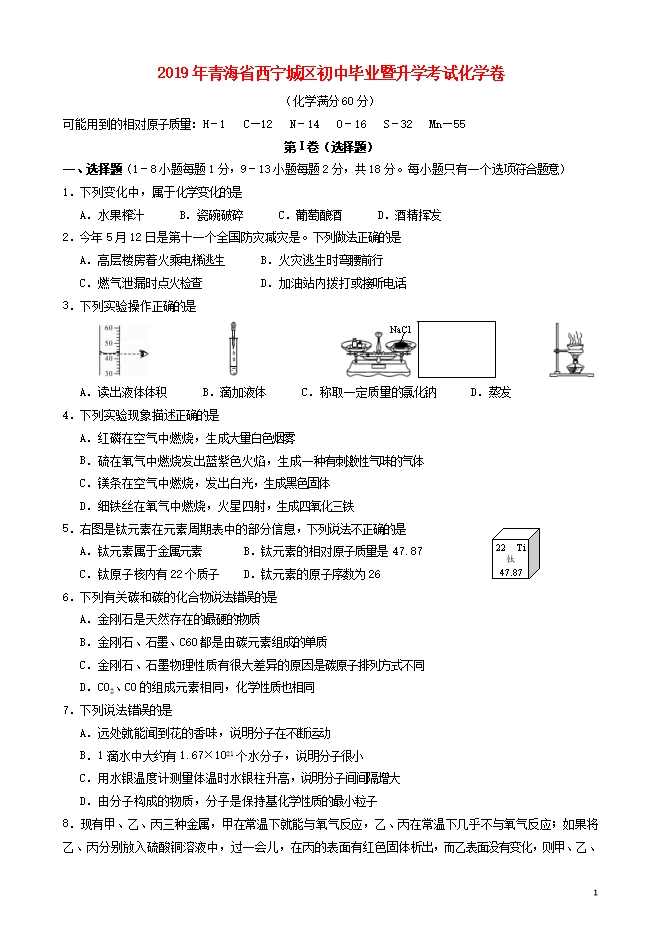 2019年青海省西宁市中考化学真题试题(word版含答案)