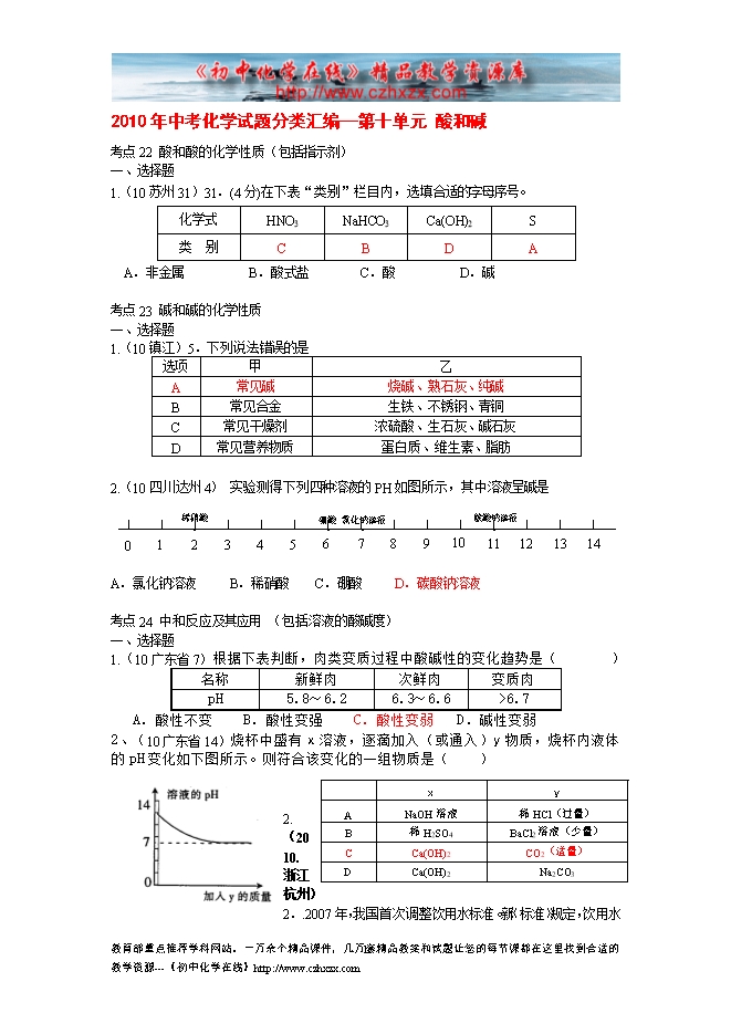 2010年中考化学试题分类汇编—第十单元 酸和碱
