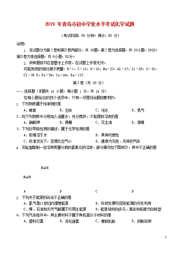 【内容简介】2019年山东省青岛市中考化学真题试题(word版含答案)