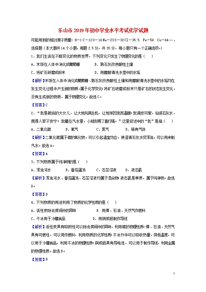 【内容简介】2019年四川省乐山市中考化学真题试题(word版含答案解析)