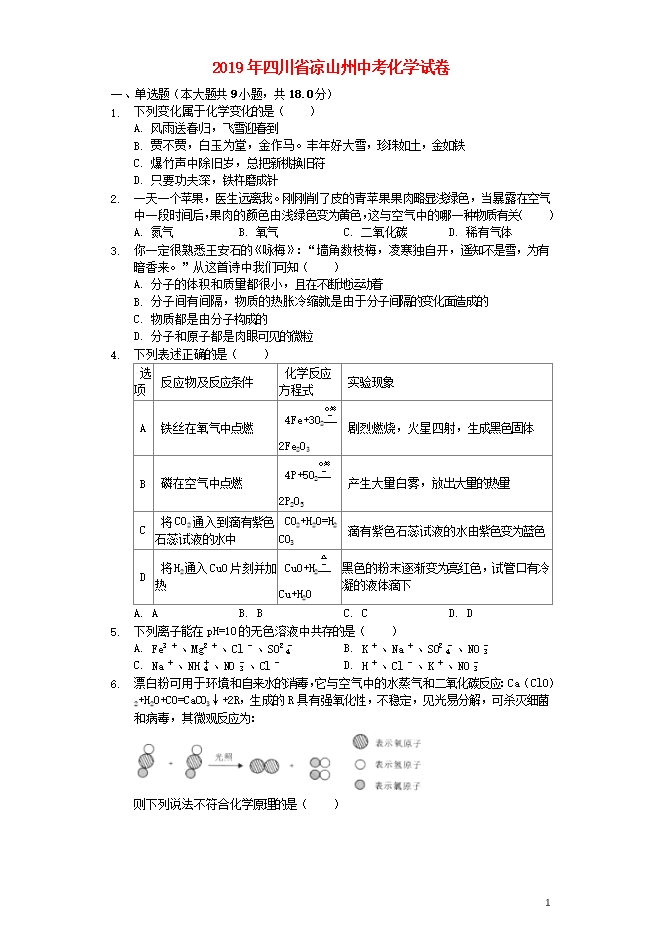 【内容简介】2019年四川省凉山州中考化学真题试题(word版含答案解析)
