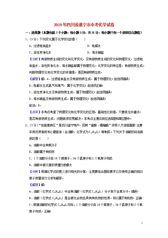 【内容简介】2019年四川省遂宁市中考化学真题试题(word版含答案解析)