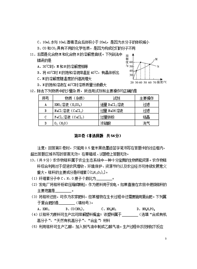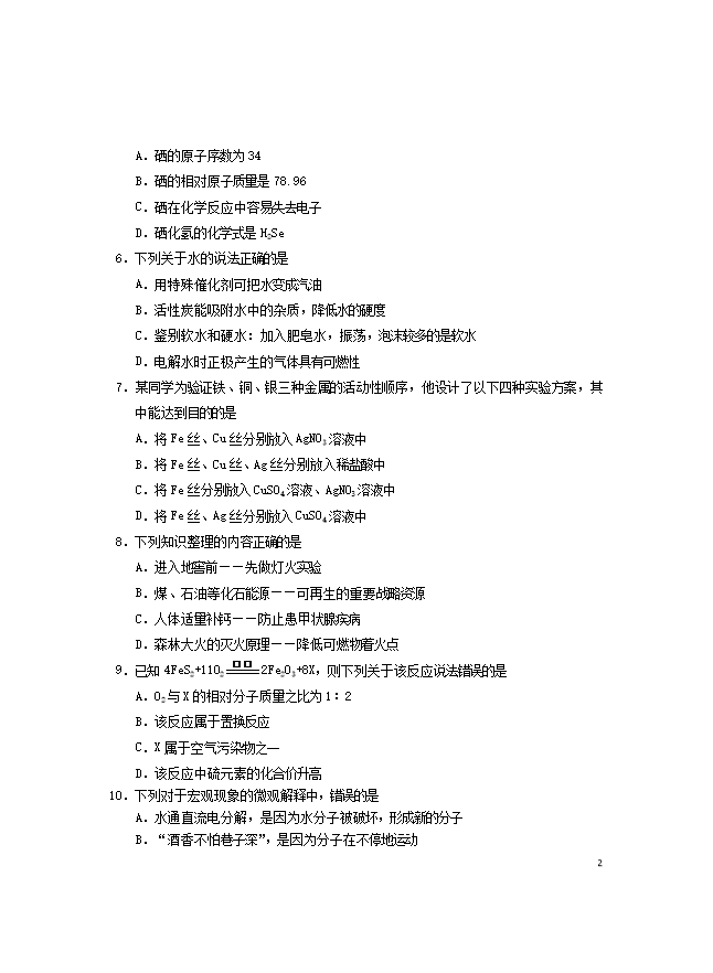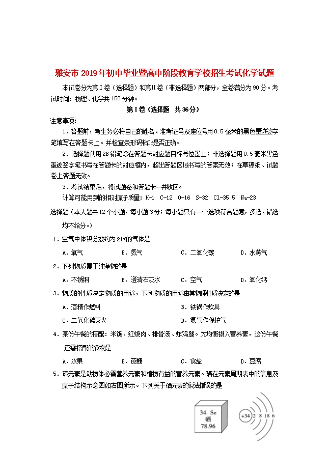 2019年四川省雅安市中考化学真题试题(word版含答案)