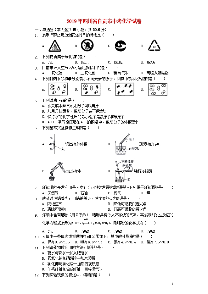 2019年四川省自贡市中考化学真题试题(word版含答案解析)
