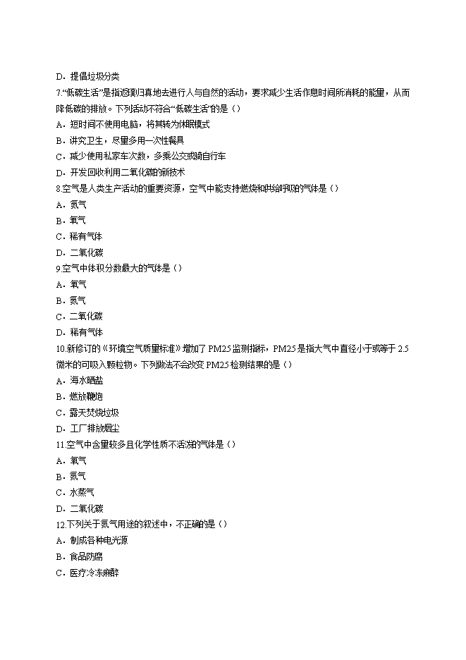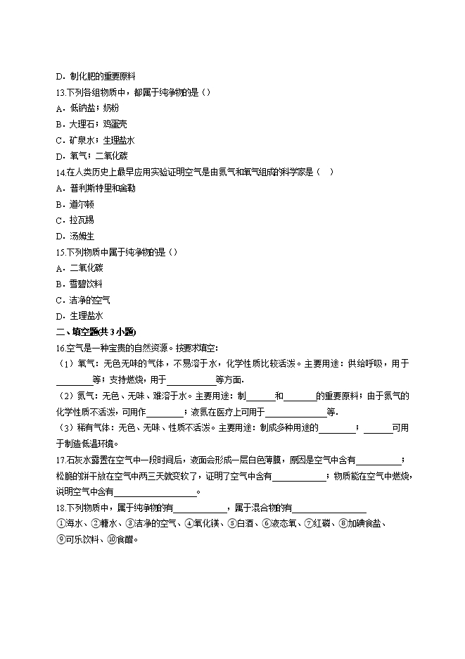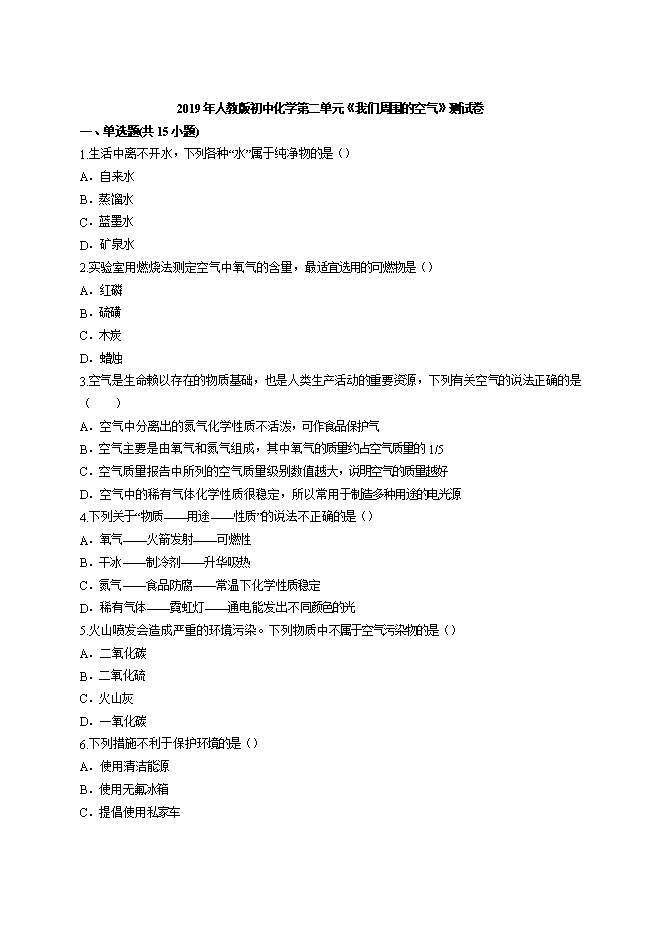 2019年人教版初中化学第二单元《我们周围的空气》测试卷(word版含答案解析)