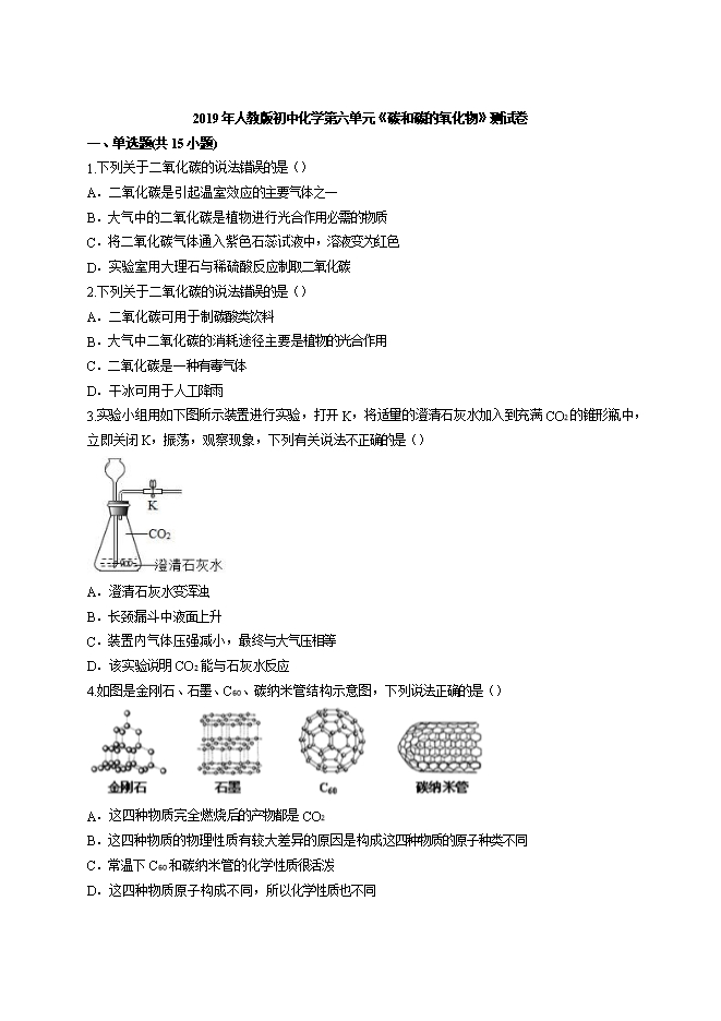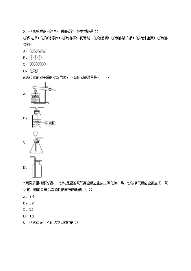 2019年人教版初中化学第六单元《碳和碳的氧化物》测试卷(word版含答案解析)