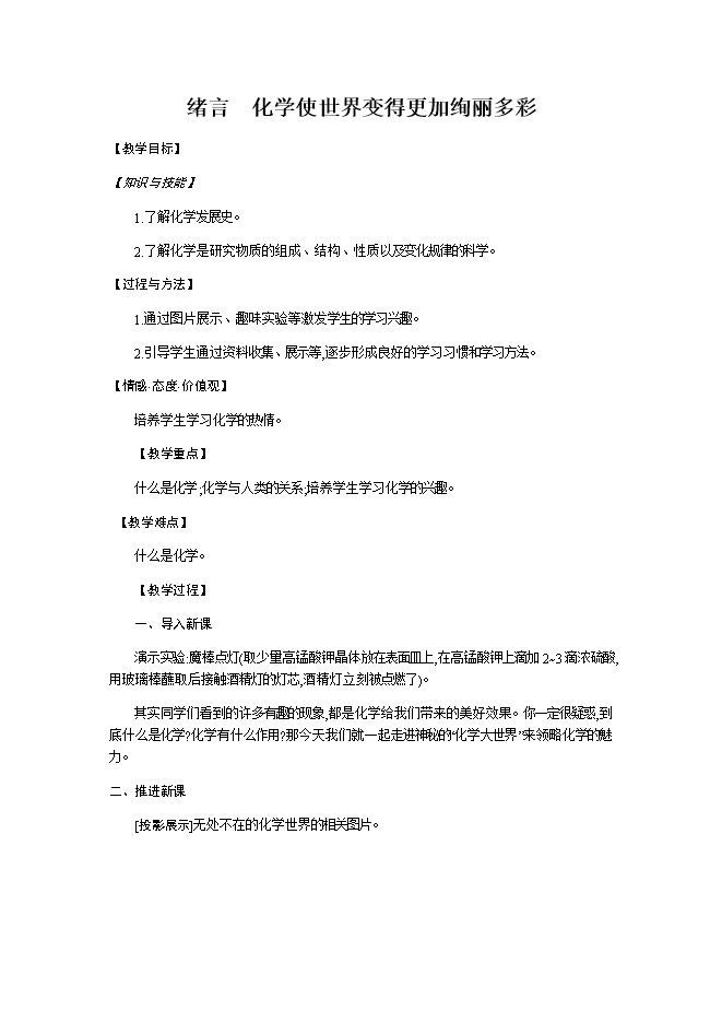 2019秋人教版九年级化学上册《绪言 化学使世界变得更加绚丽多彩》教学设计