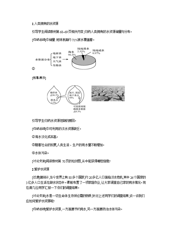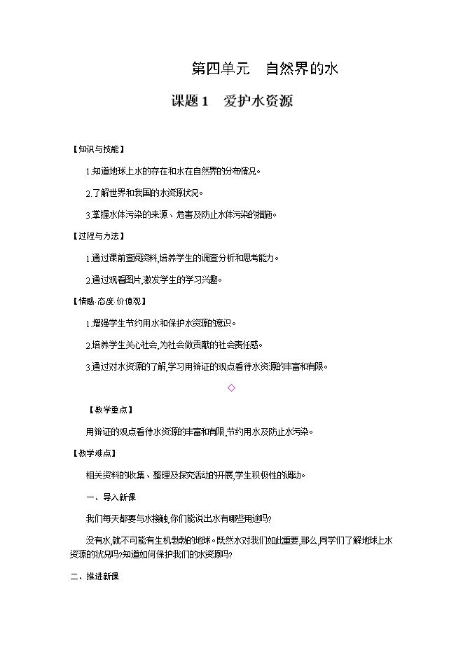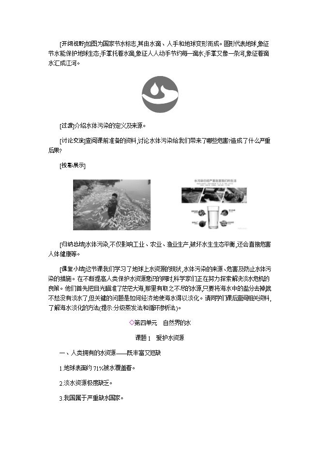 【内容简介】2019秋人教版九年级化学上册《第四单元 课题1 爱护水资源》教学设计1