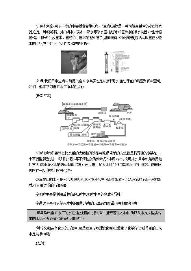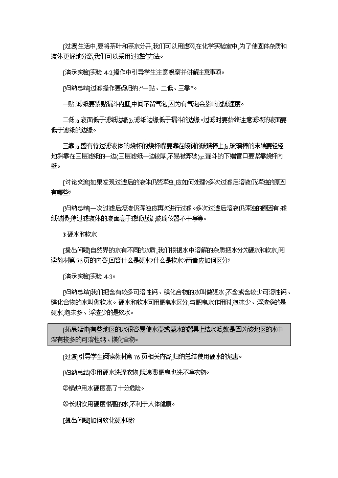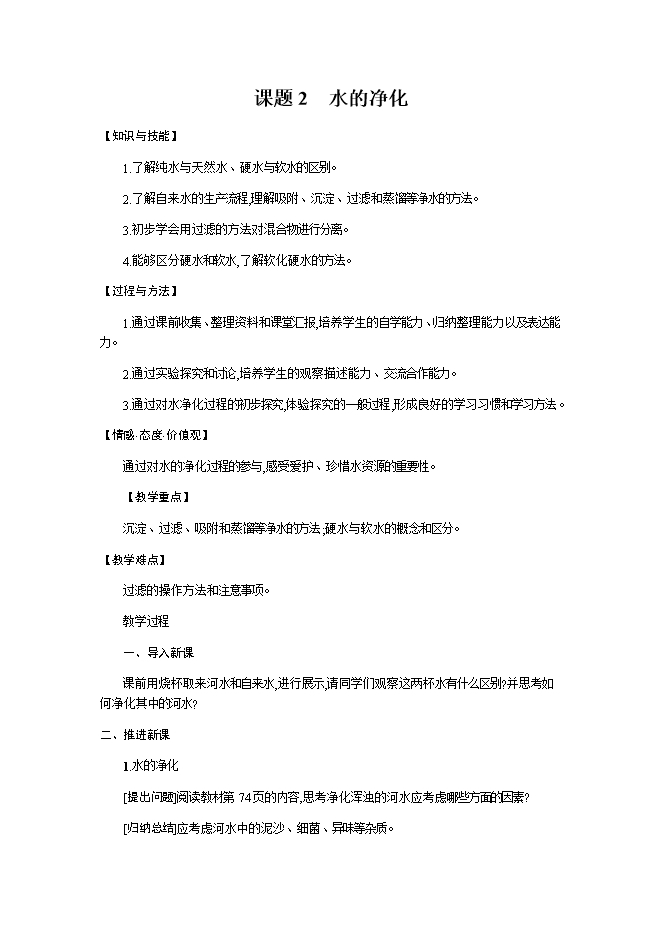 【内容简介】2019秋人教版九年级化学上册《第四单元 课题2 水的净化》教学设计1
