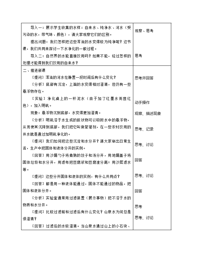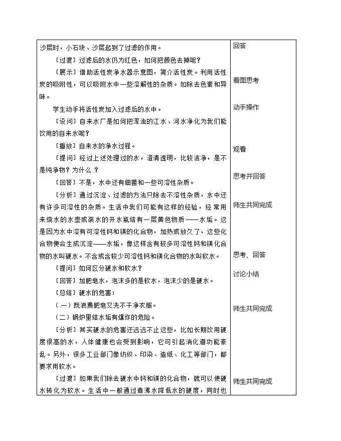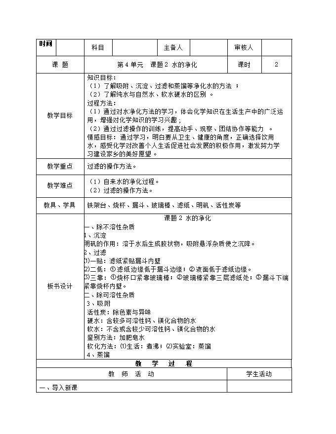 【内容简介】2019秋人教版九年级化学上册《第四单元 课题2 水的净化》教学设计2