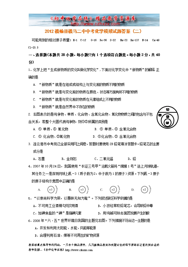- 下一份试卷:2012赣榆县赣马二中中考化学模拟试题答案(三)