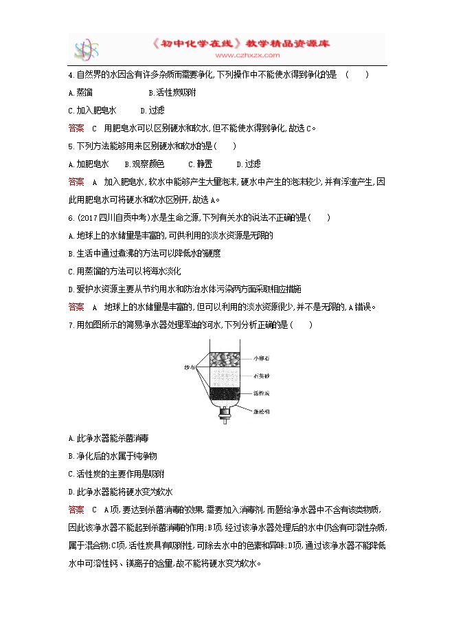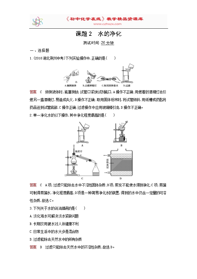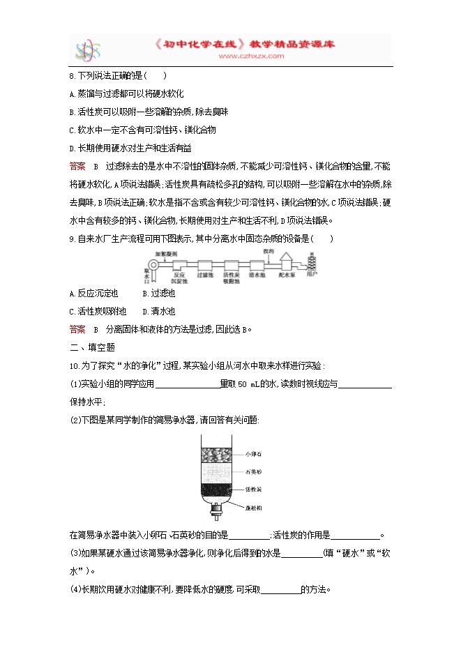 【内容简介】2019年秋季九年级人教版化学《第四单元 课题2 水的净化》同步检测(word版含答案解析)
