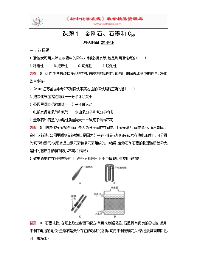 2019年秋季九年级人教版化学《第六单元 课题1 金刚石、石墨和C60》同步检测(word版含答案解析)