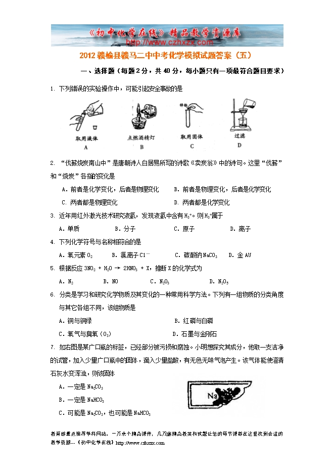 2012赣榆县赣马二中中考化学模拟试题答案(五)