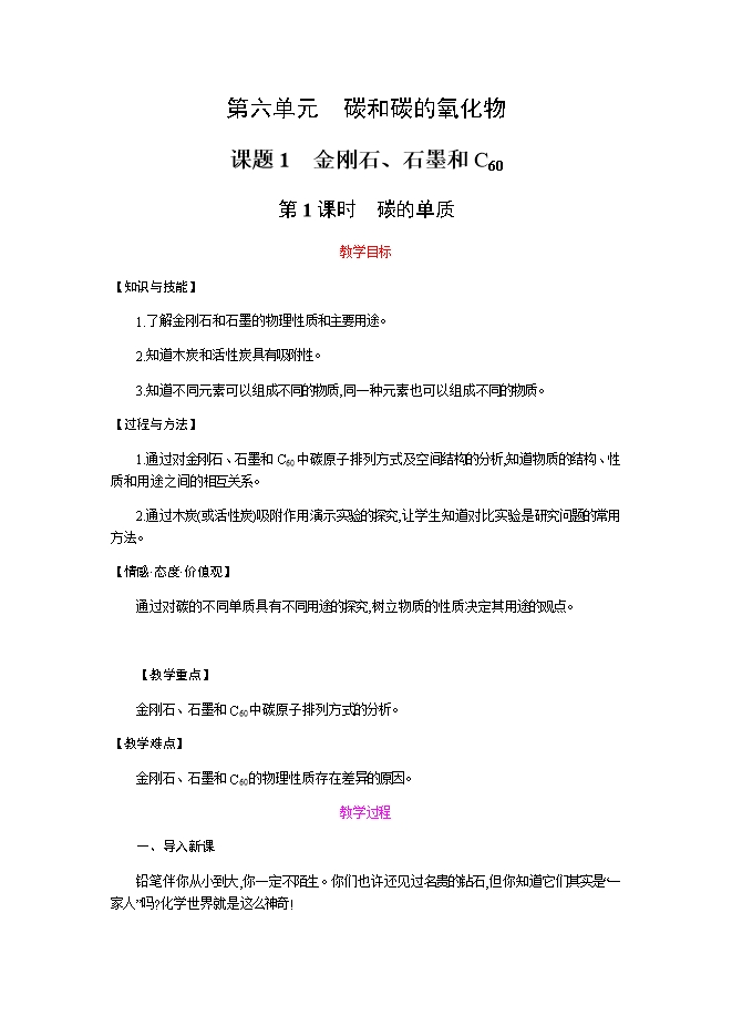 【内容简介】2019秋人教版九年级化学上册《第六单元 课题1 金刚石、石墨和C60》教学设计(第1课时)