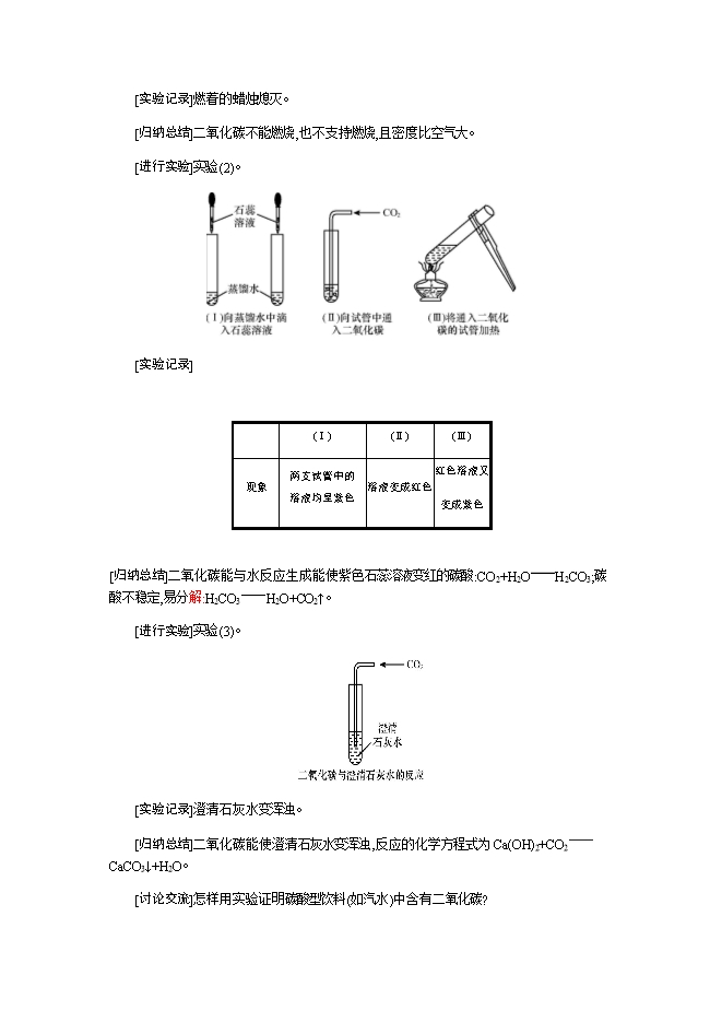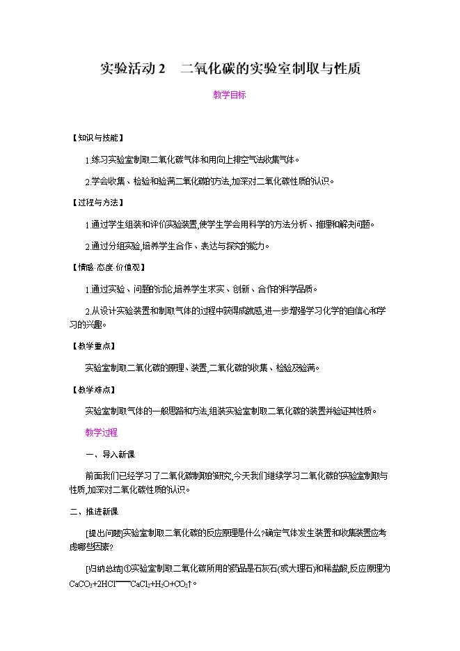 【内容简介】2019秋人教版九年级化学上册《第六单元 实验活动2 二氧化碳的实验室制取与性质》教学设计