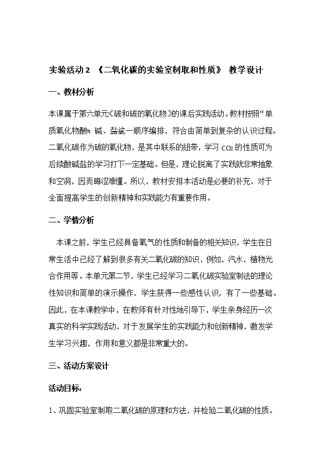【内容简介】2019秋人教版九年级化学上册《第六单元 实验活动2 二氧化碳的实验室制取和性质》教学设计2