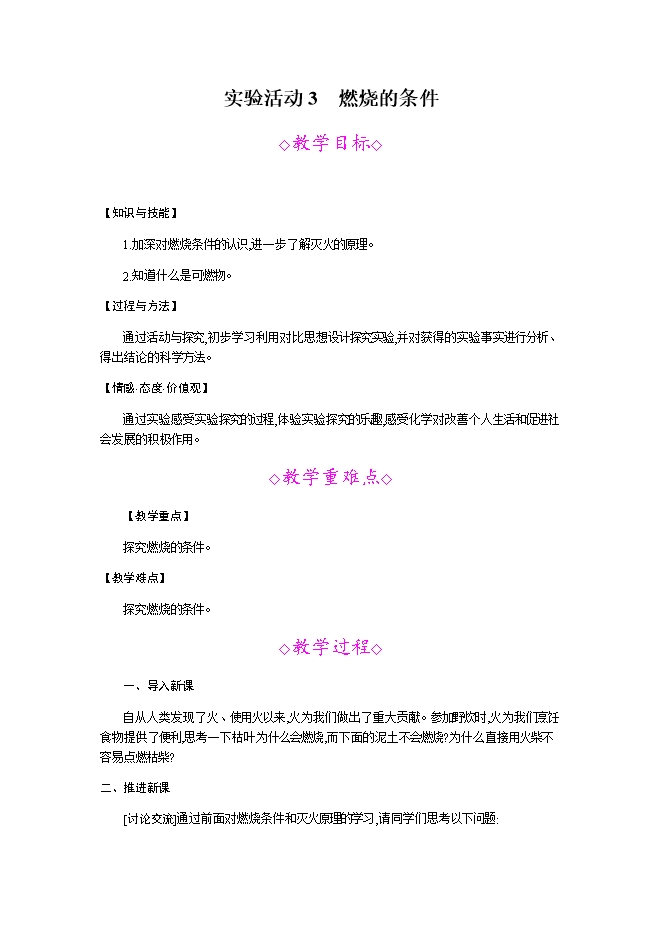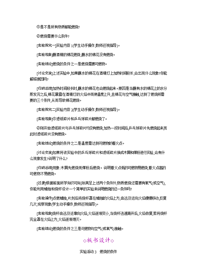 【内容简介】2019秋人教版九年级化学上册《第七单元 实验活动3 燃烧的条件》教学设计