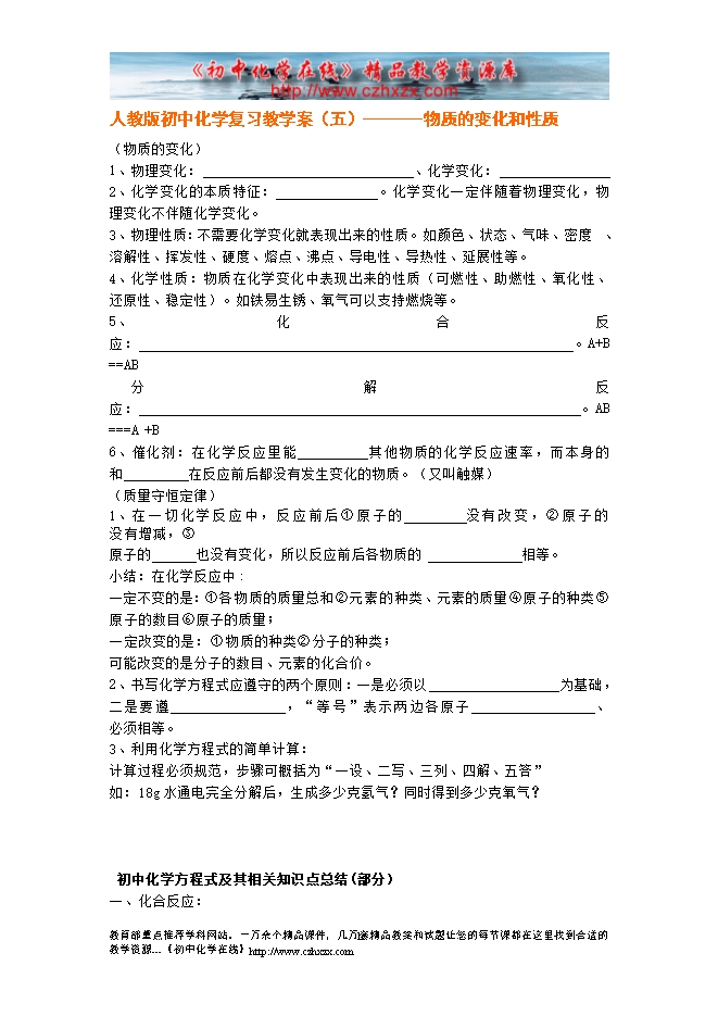 人教版初中化学复习教学案(五)-------物质的变化和性质